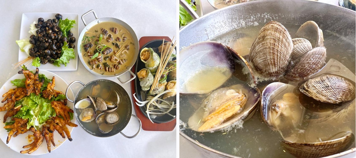 Cool place for eating many type of snails, mussels, clams and drinking. I recommend the grilled scallop with cheese btw. The price is a little higher than I expected but it was still worth to visit here.